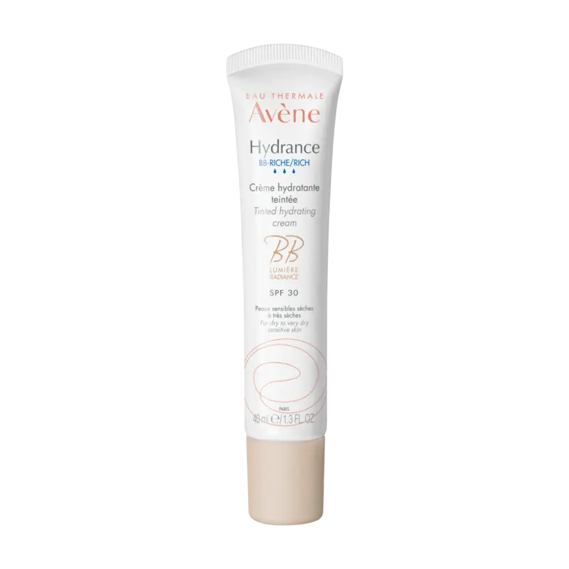 La crème hydratante teintée Hydrance BB Riche d’Avène hydrate intensément la peau tout en unifiant le teint. Sa formule enrichie en Eau Thermale d’Avène apaise et protège la peau des agressions extérieures. Idéale pour les peaux sensibles et sèches, elle offre un fini lumineux et naturel.