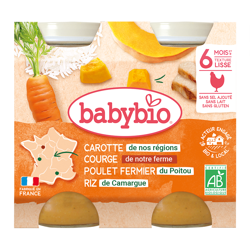 Repas bio Carotte, Courge, Poulet & Riz Babybio, une recette complète pour les bébés dès 6 mois.