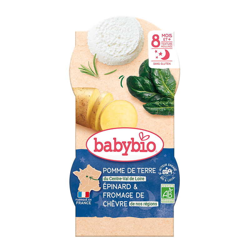 Repas bio Pomme de Terre, Épinard & Fromage de Chèvre Babybio, une recette douce et équilibrée pour les bébés dès 8 mois.