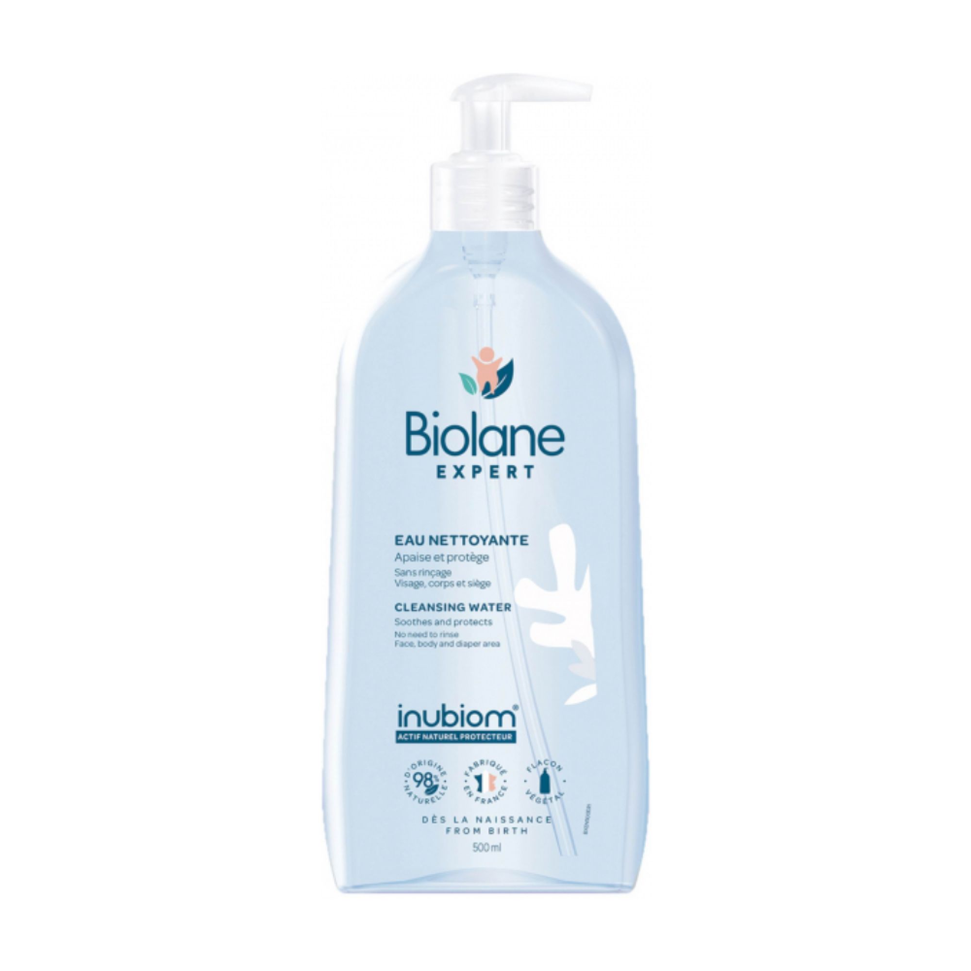 Eau Nettoyante Sans Rinçage Biolane Expert, nettoie en douceur la peau de bébé sans rinçage, idéale pour une utilisation quotidienne.