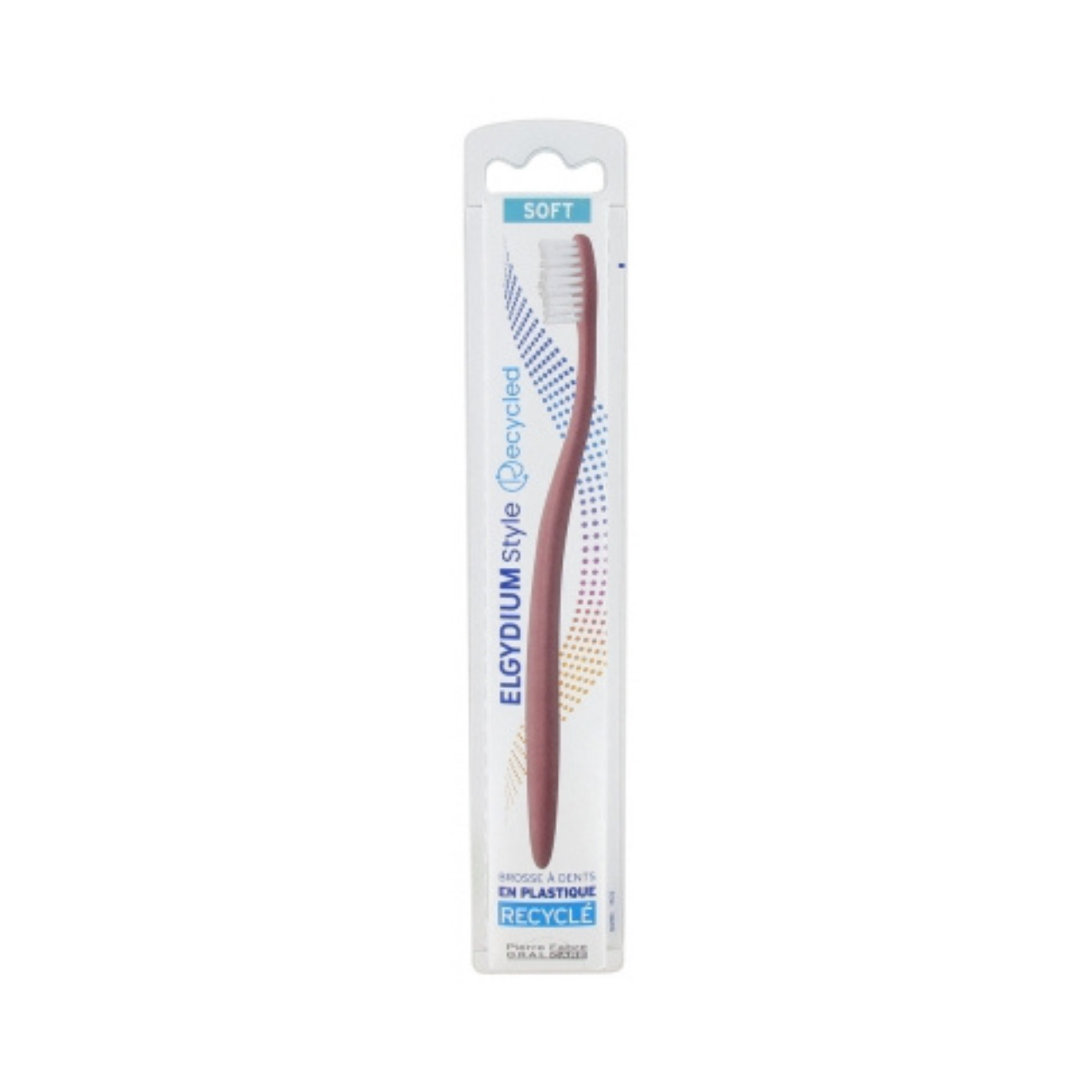 Brosse à dents Elgydium en plastique recyclé avec poils medium pour un nettoyage doux.