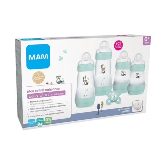 Coffret naissance MAM, biberons anti-coliques et accessoires pour un confort optimal.