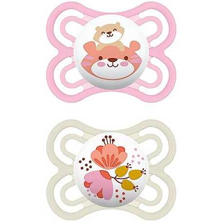 Lot de 2 sucettes MAM Perfect 0-6 Mois avec tétine en silicone SkinSoft et boîte à sucettes, motifs tigre et fleur.