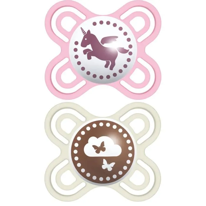 Lot de 2 sucettes MAM Perfect Naissance 0-2 Mois en silicone avec tétine anatomique et motifs licorne et papillon.