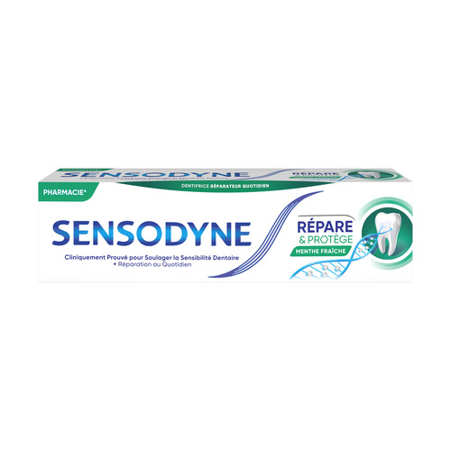 Dentifrice Sensodyne Répare et Protège Extra Fresh, pour dents sensibles et protection contre les caries.