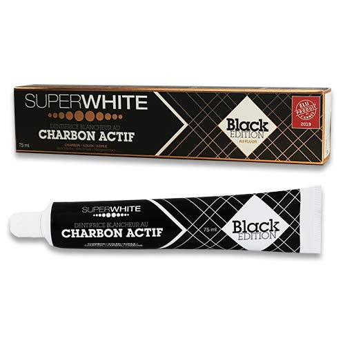 Dentifrice Superwhite Black Edition au Charbon Actif, goût menthe, tube 75ml pour blanchir les dents et combattre la plaque dentaire.