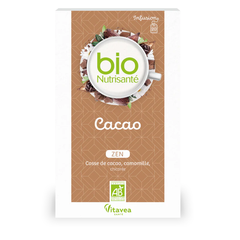 Détendez-vous avec l’Infusion Cacao Zen bio de Vitavea, un mélange réconfortant de cacao et de cannelle.